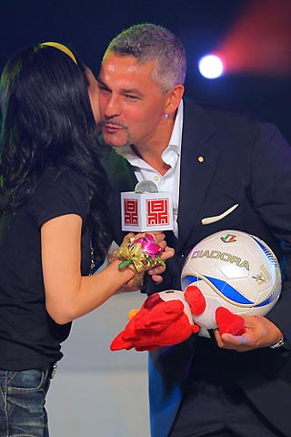 Olympic gymnastic champion Liu Xuan greets with Roberto Baggio in Beijing on August 30. Baggio arrived for a series of promotional events for the 2008 Beijing Olympic Games. [BOCOG]