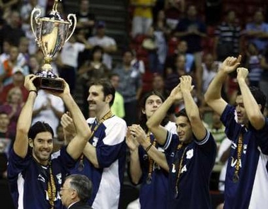 Argentina's Luis Scola (L) holds up the trophy after his team took second place in the FIBA Americas regional qualifying basketball tournament in Las Vegas, Nevada September 2, 2007. The United States and Argentina clinched berths to the Beijing 2008 Olympics. [Reuters] |