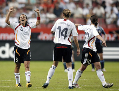 | Germany's Sandra Smisek (L) reacts after scoring a goal during a match against Argentina during their group soccer match of the 2007 FIFA Women's World Cup at the Hongkou Football Stadium in East China's Shanghai, September 10, 2007. Germany wins the opener 11-0. [Reuters] |