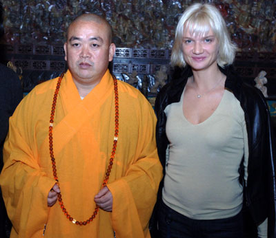 Russian Olympic gymnastics medalist Svetlana Khorkina (R) takes a photo with Shi Yongxin, the most senior monk of the Shaolin Temple in Central China's Henan Province October 25, 2007. A Russian Olympic delegation visited the famous temple, which is known around the world for its martial arts. [Xinhua]