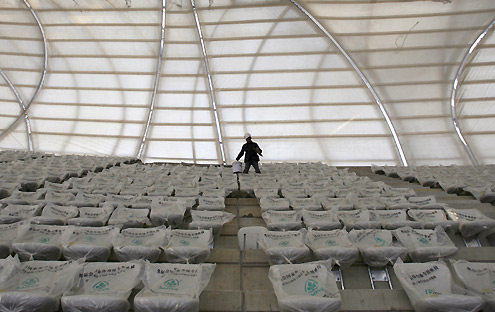 A labourer checks the newly installed chairs at the tribune inside the construction site of the National Olympic Stadium, also known as the "Bird's Nest", in Beijing November 9, 2007. The main stadium for next year's Beijing Olympic Games, the $400 million "bird's nest", will open to the public for the first time in April to host a test event. [Agencies]