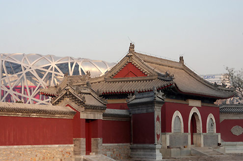 A photo taken on December 4 shows a temple and the National Stadium next to it inside the Olympic Green in Beijing.  [newsphoto]