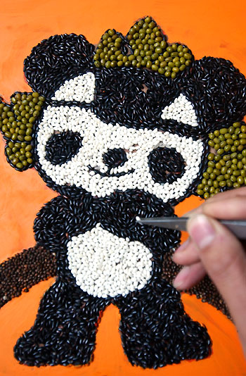 Luo Qiang, a university student from Lanzhou of Northwest China's Gansu Province, adds the finishing touches to his creation of Fuwa Jingjing - the panda - one of the five mascots for the 2008 Beijing Olympics, January 4, 2008. Luo used a variety of grains and beans to create the five figures of the Beijing Olympic mascot. [Xinhua]