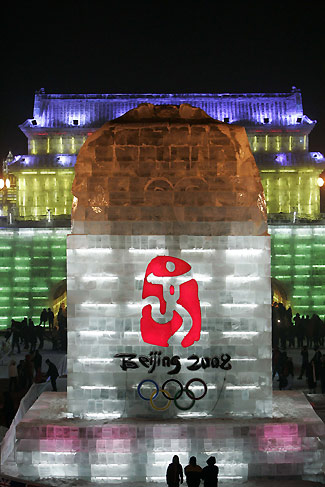 Tourists visit at a giant ice sculpture of the 2008 Beijing Olympics logo at the Ice and Snow World in Harbin, Heilongjiang Province, January 5, 2008. [Agencies]