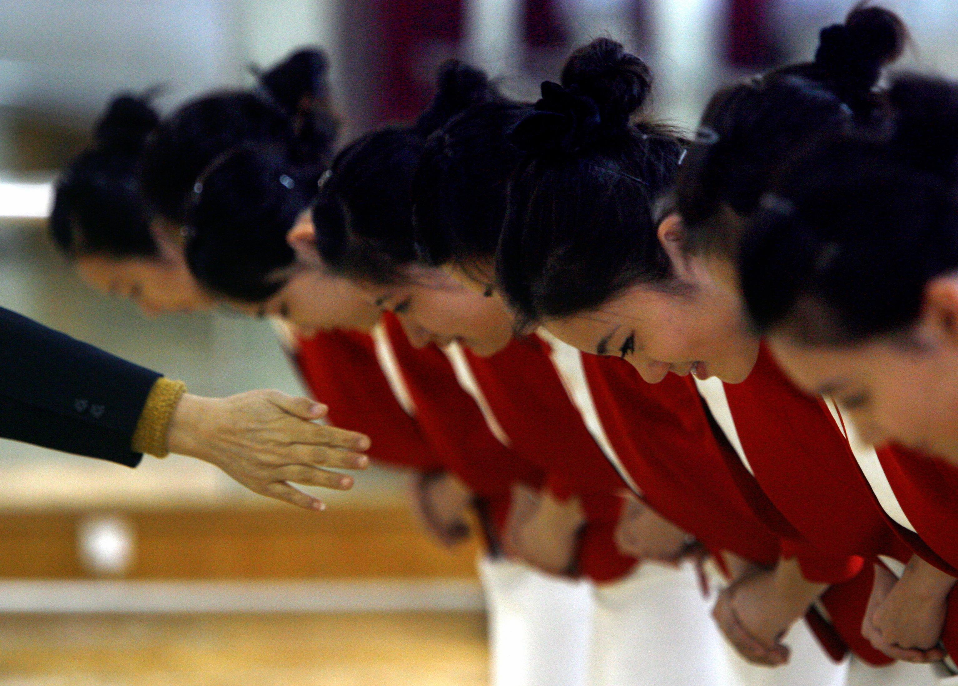 | Liu Yan Zhi (L), an etiquette instructor, talks to students during an etiquette training class at a vocational school in Beijing January 7, 2008. [Agencies] |