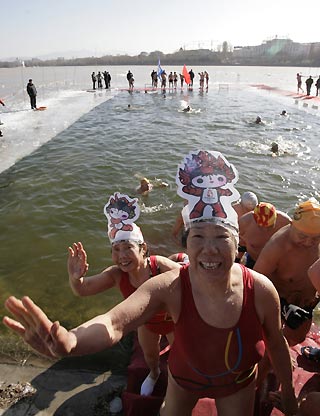 Participants of an ice swimming competition wear cardboard signs with images of the Olympic mascots over their swimming caps in Yanqing, on the outskirts of Beijing, January 12, 2008. [Agencies]