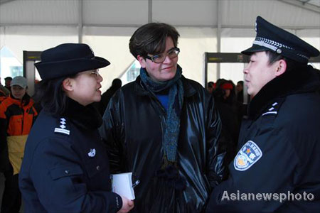 A foreign visitor talks with Chinese security guards at the National Indoor Stadium, the venue for artistic gymnastics, trampolines, and handball events for the upcoming Olympic Games, in Beijing, January 22, 2008. In preparation for serving foreign visitors at the Games, the local public security authority invited two English speakers to test the personnel. [Xinhua]