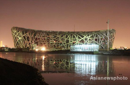 China's National Stadium, also known as "Bird's Nest," is shown in this Dec. 4, 2007 file photo as the National Aquatics Centre is lit at night in Beijing. Managers of the 91,000-seat arena, which will host the opening and closing ceremonies at the summer Games, began trials on lighting the stadium on March 3, 2008. [Asianewsphoto]
