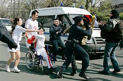 Some French media players claimed Paris is a free city and everyone has the right to assembly and demonstrate without government intervention. However, the actions by some extremists to attack the torchbearers, grab the torch and even try to extinguish the flame can no longer be called legal or non-violent protests. Chinese people are seriously disturbed and hurt by the chaotic scene in which an extremist tried to grab the torch from a weak disabled Chinese girl, named Jin Jing, in her arm wheels. Is this the civil French government’s behavior? A slap on China's face, or a slap on France's face?