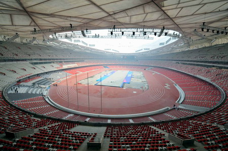 Flag poles can be seen next to the track at the National Stadium, also known as the Bird's Nest, in Beijing April 16, 2008. The stadium will host the Good Luck Beijing Race Walking Challenge on Thursday, the first event to be held at the 2008 Beijing Olympic Games athletics stadium. [Xinhua]
