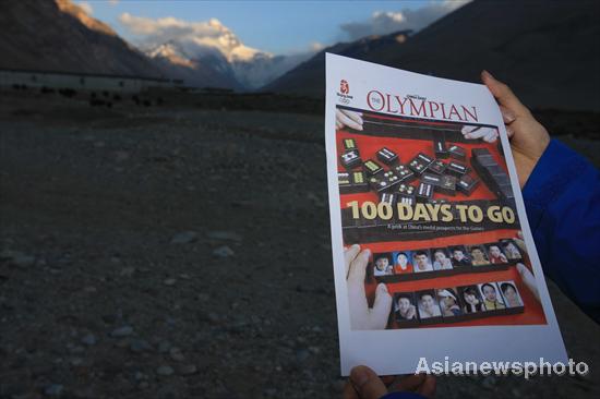 Zhang Hongjiang, a stringer for China Daily, poses for a photo with an issue of Olympian of April 30 in his hands at the Qomolangma Base Camp Wednesday April 30, 2008, 100 days before the opening of the 2008 Beijing Olympics. [Asianewsphoto]