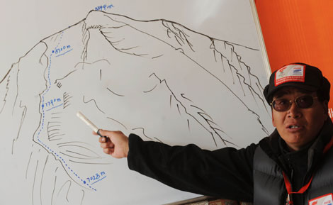 China mountaineering team spokesman Zhang Zhijian details on a diagram the proposed route for the Beijing Olympic torch's ascent of mountain Mt. Qomolangma, also known as Mt. Everest, at the Mt. Qomolangma base camp, Southwest China's Tibet Autonomous Region, May 7, 2008. Beijing Olympic torch relay will be taken to the world's highest peak by the traditional climb route along the north slope. [Xinhua]