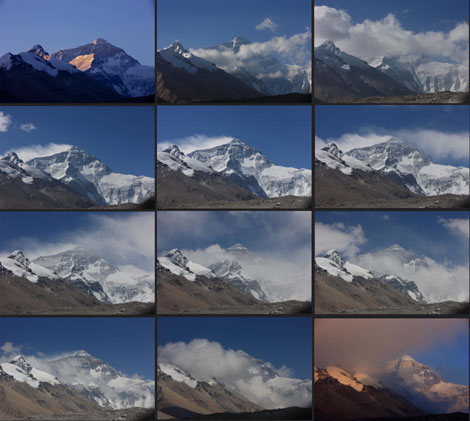 A combination photo shows the world's highest mountain Mt. Qomolangma, also known as Mt. Everest, at various times of the day. The photo was taken on May 2, 2008, at the Mt. Qomolangma base camp, Southwest China's Tibet Autonomous Region. [Xinhua]
