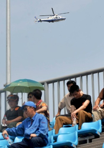 A helicopter flies over the beach volleyball venue in Chaoyang Park during an Olympic security drill in Beijing on Wednesday, June 11, 2008. [Xinhua]