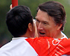 Gao Yuan (L), a Chinese calligraphy teacher, instructs two overseas Olympic volunteers how to hold their brushes in Beijing, June 24, 2008. Twenty-four students from the University of Iowa in the United States, who will serve as Olympic media volunteers in August, started their week-long orientation course on Chinese culture, environment, economy, media and ethnic minorities at Tsinghua University as of Monday. [Xinhua]