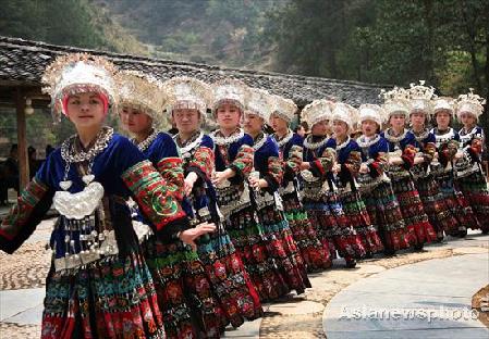 Dancers of the Miao ethnic group perform to the drum beat in Guizhou in this March 29, 2008 file photo. They, together with 25 other folk dance groups, were recently selected to perform prior to the opening ceremony of the 2008 Beijing Olympic Games in August. [Asianewsphoto]