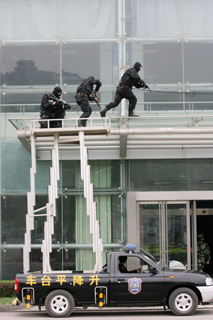 Armed policemen take control of the top points quickly in a anti-terrorist drill dubbed "Mountain Tai 2008" in Jinan, capital city of east China's Shandong province, June 30, 2008. This exercise aims to test the ability of the reaction, organization, direction and comprehensive safeguard against terrorism. [Xinhua]