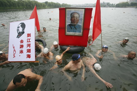 Residents hold a portrait of late Chinese leader Chairman Mao Zedong while swimming in the Yong River in Nanjing, Jiangsu province, July 13, 2008. The swimming activity was held to mark the 42nd anniversary of Mao swimming in the Yangtze River and to welcome the upcoming 2008 Beijing Olympic Games, local media reported. The Chinese characters on the other plate read, "Go to the river, lake and ocean to swim". [Agencies]