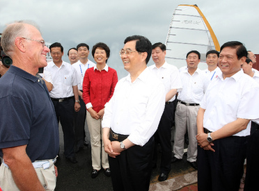 Hu visited the Qingdao Olympic Sailing Center, highly praising the adoption of renewable energy and environment-friendly materials in the center's buildings.