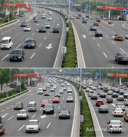 A combo picture shows vehicles travel on the Beijing East 4th Ring Road during rush hour on July 18, 2008 (bottom) and July 20. [Asianewsphoto]
