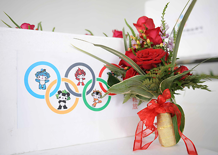 A bouquet of sample flowers for medal winners at the Beijing Olympics are seen at the Olympic flower distribution centre in Beijing July 25, 2008. About 6,000 bouquets of flowers will be arranged for the upcoming Olympic and Paralympic Games. [Xinhua]