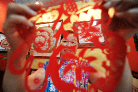 Folk artist Sun Erlin displays a piece of her paper-cutting in the shape of the Chinese character "fu", which means "happiness". The 47-year-old Sun from Inner Mongolia Autonomous Region will display her paper-cuttings at the Olympic Village during the Games. [Xinhua]