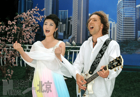 Chinese soprano Zhu Jiali (L) and US pop singer Troy Lush(R) sing a duet of "The Power of Agglomeration" a Beijing Olympics themed song for MTV, in Beijing, Aug. 4, 2008. The song was written by Lush and specially dedicated to the 2008 Beijing Games. It is currently being shot and will be broadcast worldwide during the Games. [www.bj.xinhuanet.com]