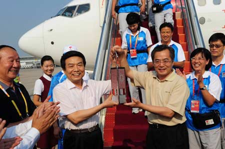 Xiang Zhaolun (R, front), deputy secretary-general of the State Council of China, and Cai Fuchao, vice mayor of Beijing, hold the the flame upon its arrival during a simple reception at the Beijing Capital International Airport in Beijing, China, Aug. 5, 2008. The Olympic flame arrived in the host city Beijing on Tuesday afternoon, ready for the final leg of its global relay before the 29th Olympic Games open on Friday. [Xinhua]