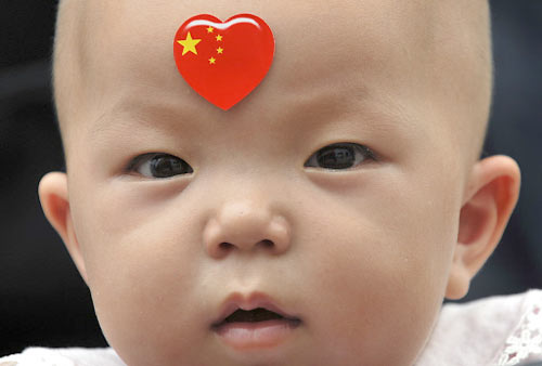 | A babygirl with a heart-shaped Chinese flag stuck to her forehead sits in a pushchair on August 6, 2008 in the center of Beijing, two days before the beginning of the 2008 Beijing Olympic Games. The 2008 Beijing Olympic Games will be held in China from August 8 to 24. [Agencies] |