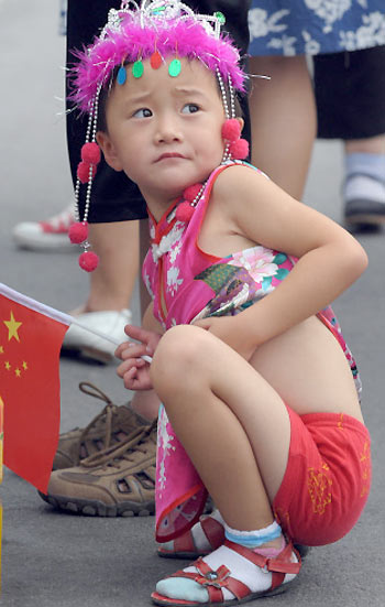 A Chinese girl wearing a traditional costume holds a Chinese flag in Beijing on August 6, 2008, two days before the beginning of the 2008 Beijing Olympic Games. The 2008 Beijing Olympic Games will be held in China from August 8 to 24. [Agencies]