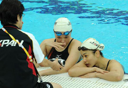 Kaneko Masako (L), coach of Japan's synchronised swimming team shows a video of their performance to team members during a training session at the National Aquatics Center, August 6, 2008. [Sina.com]