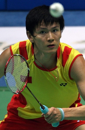 Badminton player Bao Chunlai of China plays a shot during a training session at the Beijing University of Technology Gymnasium in Beijing on August 7, 2008, the day before the opening of the 2008 Beijing Olympic Games. Lin Dan and his comrades launch their bid for a clean sweep of the Olympic gold medals in badminton on August 9, with arch rivals Malaysia, Indonesia and South Korea determined to halt the charge. [Agencies]