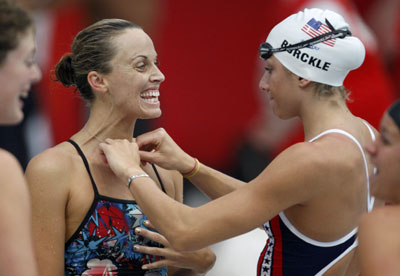 US swimmers Amanda Beard (L) and Caroline Burckle attend a training session ahead of the Beijing 2008 Olympic Games August 8, 2008. All About the Opening of Beijing Olympics [Agencies]