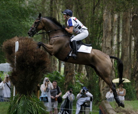 Britain's Mary King riding Call Again Cavalier clears a fence during the equestrian eventing cross country competition at the Beijing Olympic Games 2008 in Hong Kong August 11, 2008. [Agencies]