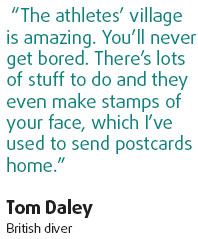 "The athletes' village is amazing. You'll never get bored. There's lots of stuff to do and they even make stamps of your face, which I've used to send postcards home," said British diver Tom Daley. "It's great to go into the food hall and see all the different sports stars from all over the place and be free to go and speak to them."