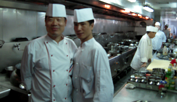 Head chef Cheng Guohai (L) poses with his colleague in the kitchen of the four-star China People's Palace Hotel, handpicked by BOCOG as one of the 113 "Official Reception Hotels" for 2008 Beijing Olympic Games. All of those picked have signed contracts with BOCOG and are set to provide both lodgings and food. [On the Courtesy of China People's Palace Hotel]
