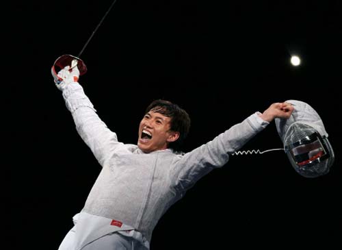 China's Zhong Man celebrates after winning the men's individual sabre final match over France's Nicolas Lopez (unseen) on August 12, 2008 at the Fencing Hall of National Convention Center at the 2008 Beijing Olympic Games. Zhong, 25, gave China their second Olympic fencing title, 24 years after Luan Jujie won the foil in Los Angeles in 1984. [Agencies]