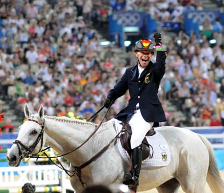 German Hinrich Romeike celebrates with his horse "Marius" during the equestrian eventing competition of the 2008 Beijing Olympic Games on August 12, 2008 in Hong Kong. Germany won gold in the three-day eventing team competition while Australia won the silver medal and Great Britain the bronze. [Agencies]