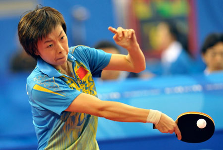 China's Zhang Yining (L) plays against Croatia's Boros Tamara (not pictured) during the Women's Team table tennis competition of the 2008 Beijing Olympic Games at the Peking University gymnasium in Beijing on August 13, 2008. [Agencies]
