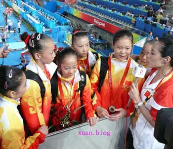 Liu Xuan, gold medal winner on the balance beam at the 2000 Sydney Olympic Games, interviews women's gymnasts August 13, 2008. China won the women's gymnastics team gold medal at the Beijing Olympic Games in Beijing on Wednesday.[sohu.com]