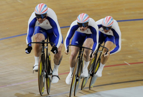(L-R) Great Britain's Jamie Staff, Jason Kenny and Chris Hoy compete in the 2008 Beijing Olympic Games men's track cycling team sprint qualifying at the Laoshan Velodrome in Beijing on August 15, 2008. Scotland's Chris Hoy anchored Britain's three-man sprint team to the fastest time in qualifying for the first round of the competition here Friday.[Agencies]