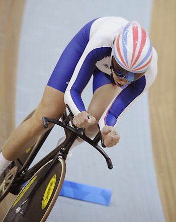 Track cyclist Rebecca Romero of Great Britain competes in the 2008 Beijing Olympic Games women's individual pursuit first round at the Laoshan Velodrome in Beijing on August 16, 2008.[Agencies]