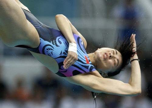 Guo Jingjing of China dives during the women's 3m springboard diving final at the National Aquatics Center during the 2008 Beijing Olympic Games in Beijing on August 17, 2008. Guo Jingjing of China won the gold medal in the women's 3m springboard diving final, followed by Julia Pakhalina of Russia with silver and Wu Minxia of China with bronze. [Agencies]