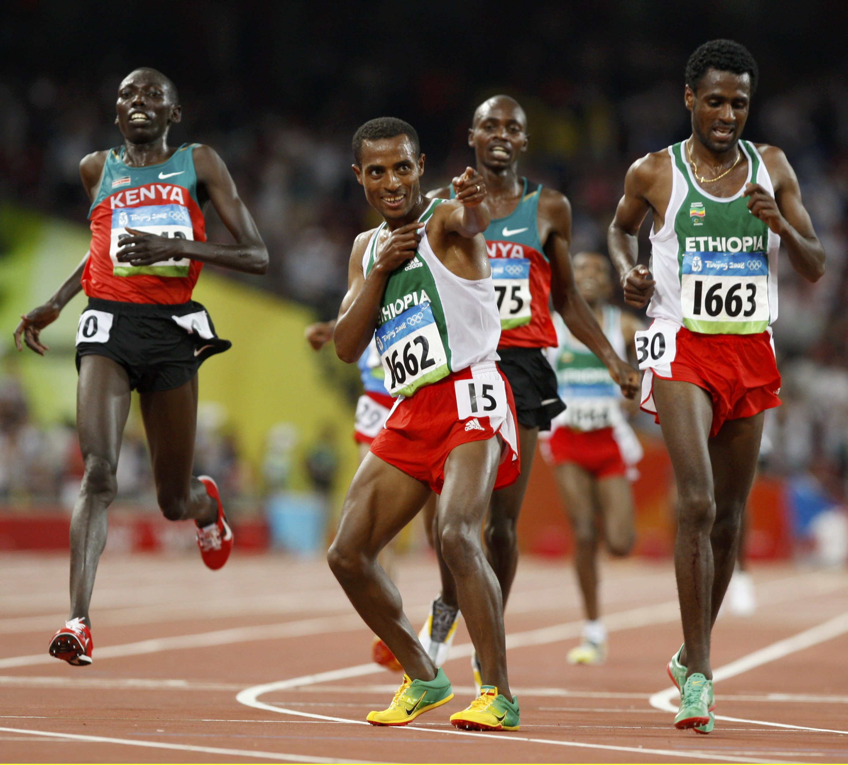 Kenenisa Bekele of Ethiopia celebrates winning the men's 10,000m final of the athletics competition in the National Stadium at the Beijing 2008 Olympic Games August 17, 2008. Sileshi Sihine (R) of Ethiopia finished second. [Agencies]