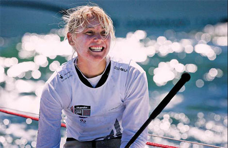British sailor Sarah Webb smiles after winning the Finn class competition, in July last year, during the Olympic Sailing World Championships in Portugal. AFP