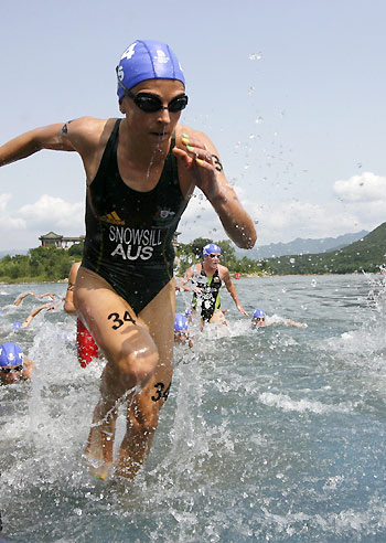 Emma Snowsill of Australia competes in the women's triathlon at the Ming Tomb reservoir in the Changping District of northern Beijing during the Beijing 2008 Olympic Games August 18, 2008. [Agencies]