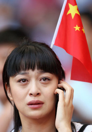 A spectator cries after China's Liu Xiang failed to compete in the men's first round 110m hurdles heat 6 at the "Bird's Nest" National Stadium during the 2008 Beijing Olympic Games on August 18, 2008. [Agencies] Fans cry as Liu quits