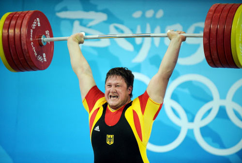 Matthias Steiner of Germany competes in the men's +105 kg weightlifting event during the 2008 Beijing Olympic Games in Beijing on August 19, 2008.[Agencies]