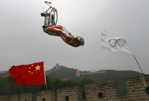 A student from Tagou Martial Arts School from Henan province jumps with a pair of spring-loaded stilts during a photo opportunity on the Badaling section of the Great Wall on the outskirts of Beijing, August 20, 2008. Some 199 students from the school will perform during the closing ceremony of Beijing 2008 Olympic Games and have been training on the outskirts of Beijing for more than half a year, local media reported.[Agencies]