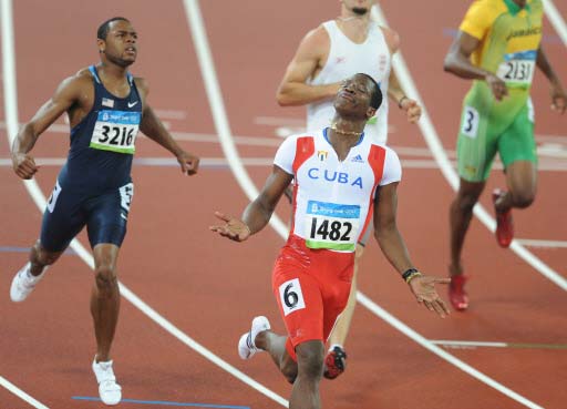 Cuba's Dayron Robles (front) celebrates as he crosses the finish line ahead of David Payne of the US (L) to win the men's 110m hurdles final at the National Stadium as part of the 2008 Beijing Olympic Games on August 21, 2008. Cuba's Dayron Robles won ahead of US athletes David Payne and David Oliver. [Agencies]